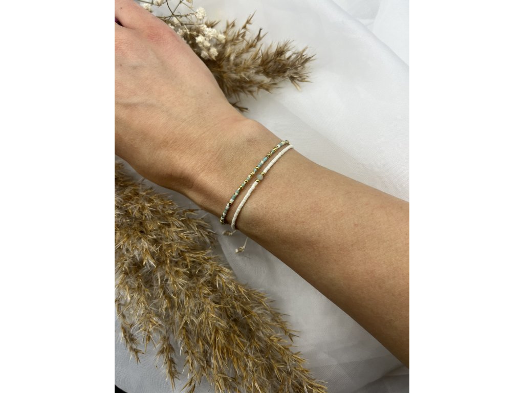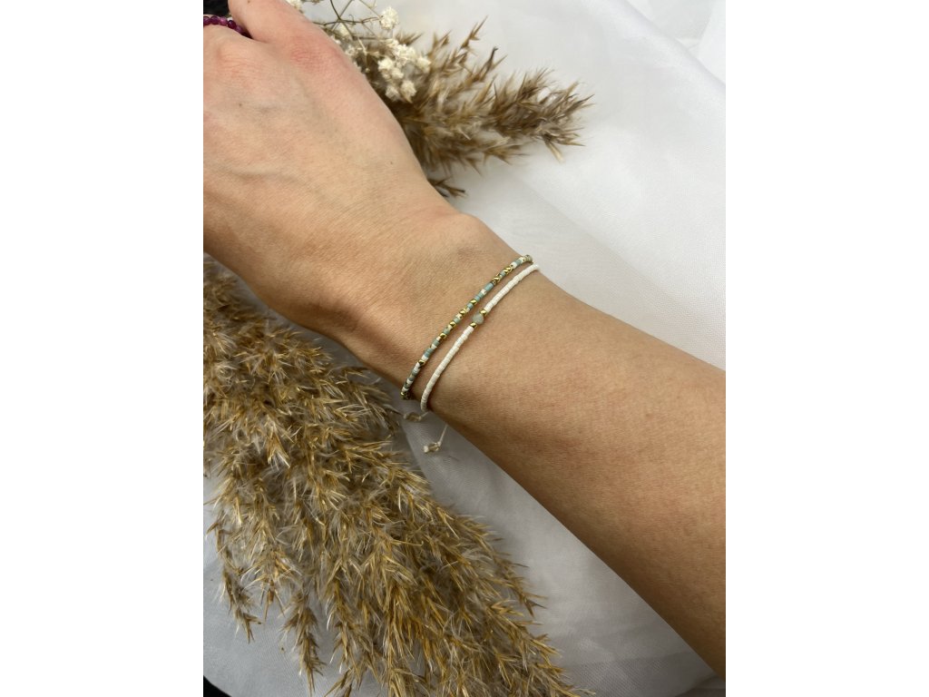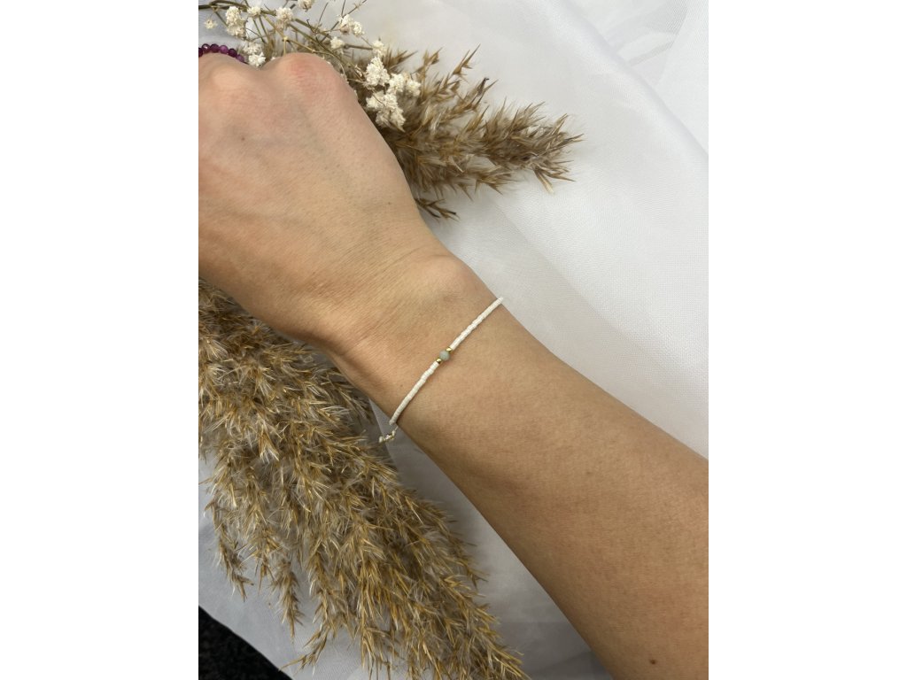 Náramek Jemná duše 🤍✨ je minimalistický ručně vyráběný šperk s jemným detailem z japonských korálků. Ve středu ho doplňuje broušený amazonit a korálky ve zlaté, stříbrné nebo rose gold variantě 💚. Díky posuvnému zapínání na nylonovém provázku se pohodlně přizpůsobí každé ruce a stane se tvým nenápadným talismanem pro každý den. 🌿